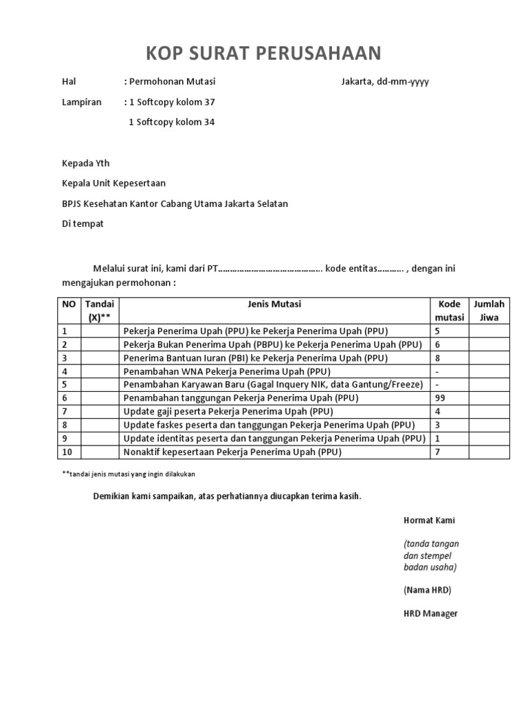 Lampirkan Surat Permohonan Mutasi yang telah ditandatangi serta diberi cap perusahaan beserta Formulir BPJS Kesehatan 37 Kolom yang telah dilengkapi.