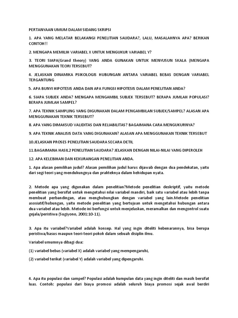 Jangan sekali-kali anda mengungkapkan bahwa judul penelitian yang anda ajukan karena judul tersebut diberikan oleh pembimbing dan disuruh oleh pembimbing. Mengapa Anda memilih judul skripsi ini. 9 pertanyaan 1.