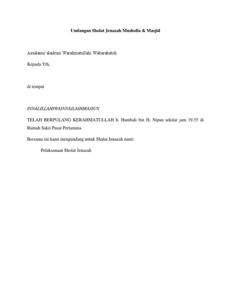Undangan sholat jenazah document photograph results. Saya seorang muadzin sebuah masjid di dekat masjid saya ada masjid yang di dalamnya akan dilaksanakan shalat jenazah. Begitulah kira-kira pelajaran yang didapat dari kisah perseteruan antara Haji Abdul Malik Karim Amrullah Hamka dan Presiden pertama RI Soekarno.