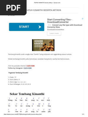 Mangka kanthining tumuwuh Salami mung awas eling Eling lukitaning alam Dadi wiryaning dumadi Supadi nir ing sangsaya Yeku pangreksaning urip. TEMBANG KINANTHI 1 Mangka kanthining tumuwuh Salami mung awas eling Eling lukitaning alam Dadi wiryaning dumadi Supadi nir ing sangsaya Yeku pangreksaning urip. Scribd is the worlds largest social reading and publishing site.