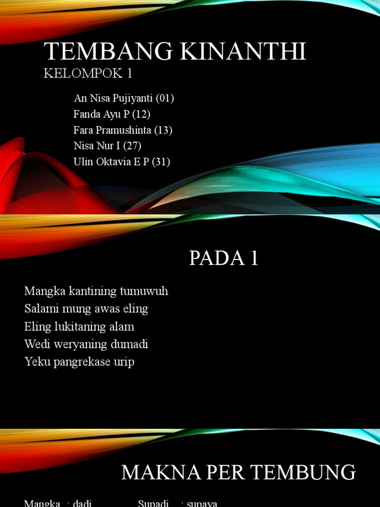Mangka kanthining tumuwuh Salami mung awas eling Eling lukitaning alam Dadi wiryanbing dumadi Supadi nir ing sangsaya Yeku pangreksaning urip padahal bekal hidup selamanya waspada dan ingat ingat akan pertanda yang ada di alam ini menjadi kekuatannya asal-usul supaya lepas dari sengsara begitulah memelihara hidup bait dari tembang kinanthi. Padahal bekal hidup selamanya waspada dan ingat Ingat akan pertanda yang adadi alam ini Menjadi kekuatannya asal-usul supaya lepas dari. Tembang kinanthi merupakan tembang ke empat dari sebelas judul tembang macapat.