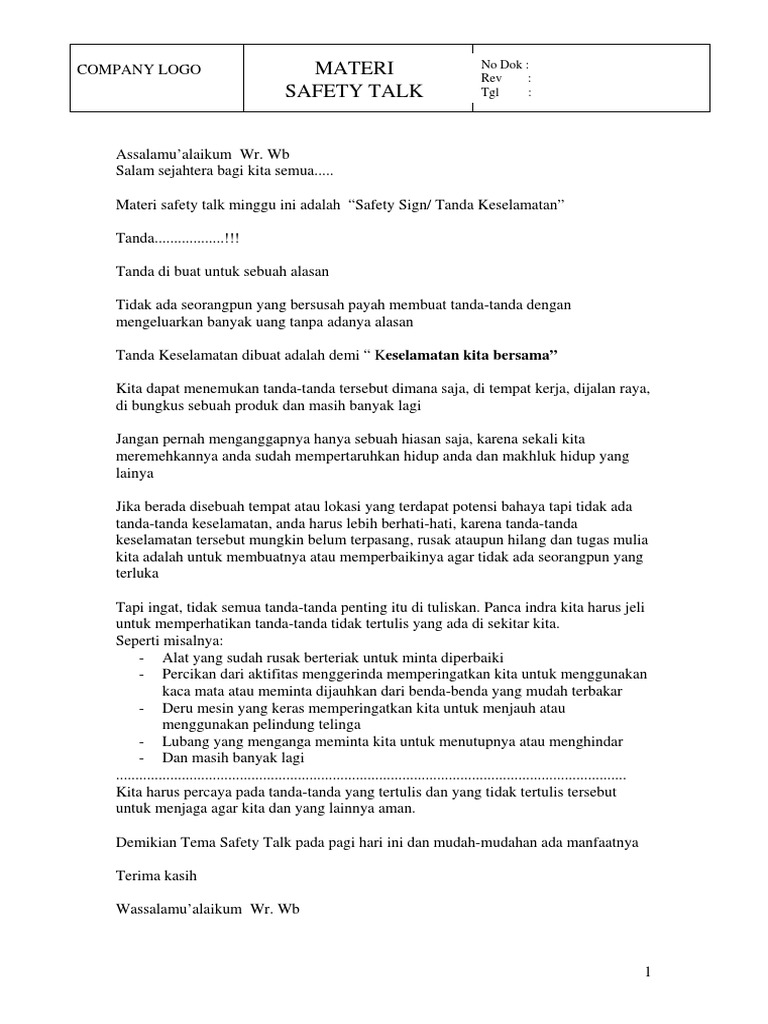 Doc Contoh Kumpulan Safety Talk Marwan Hendrianes Academia Edu